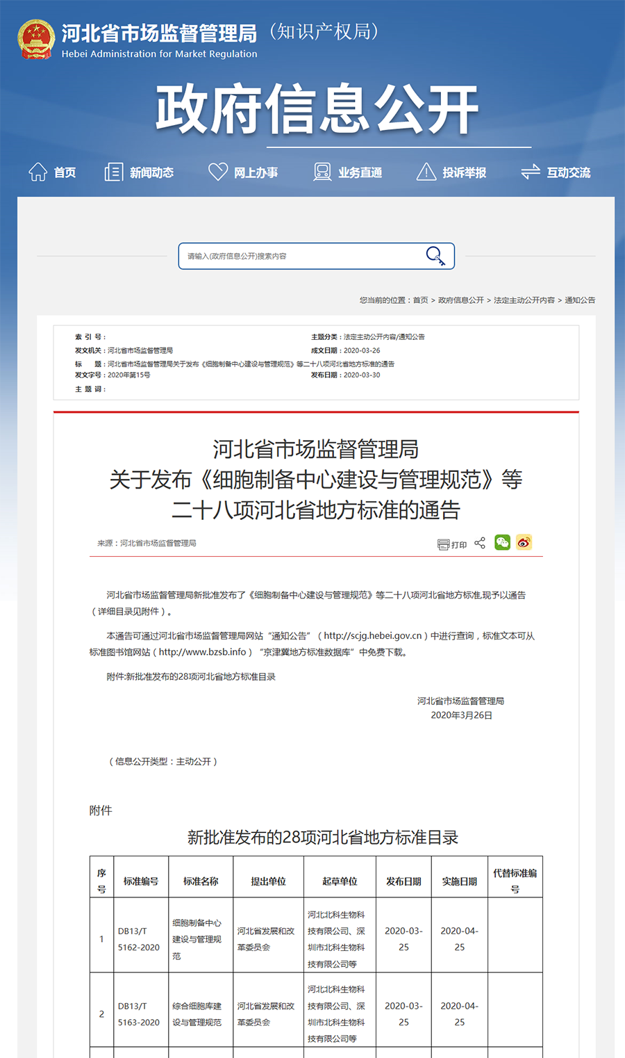 3月25日,河北省市場監(jiān)督管理局發(fā)布通知,《細胞制備中心建設與管理規(guī)范》(編號:DB13/T5162-2020)、《綜合細胞庫建設與管理規(guī)范》(編號:DB13/T5163-2020)正式批準發(fā)布,將于4月25日正式實施。兩項標準是河北省標準化體系建設的重要組成部分之一,由河北省市場監(jiān)督管理局組織,河北省發(fā)展和改革委員會提出,河北北科生物科技有限公司,深圳市北科生物科技有限公司、個體化細胞治療技術(shù)國家地方聯(lián)合工程實驗室(深圳)共同編制完成。
