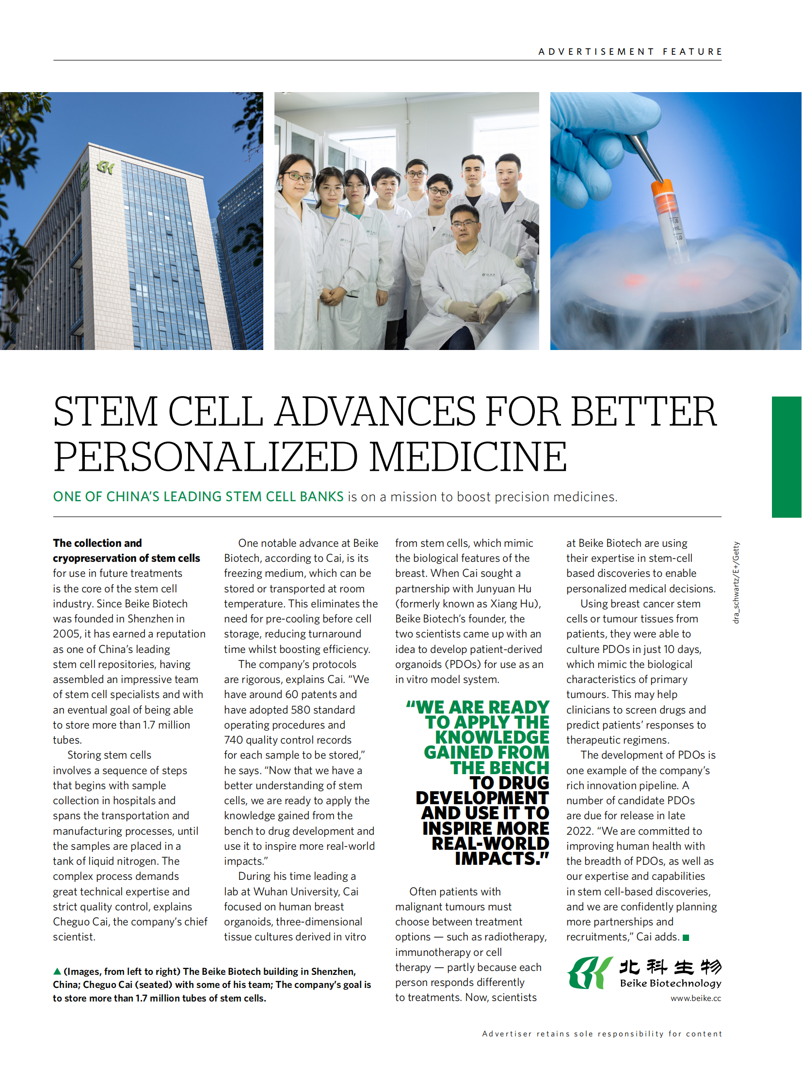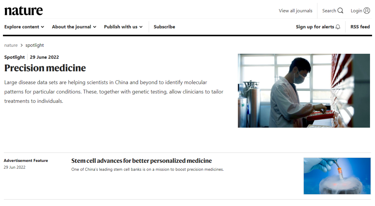 2022年6月29日,《Nature》官網(wǎng)nature spotlight增刊的“自然聚焦-中國精準(zhǔn)醫(yī)療”板塊在線發(fā)表了北科生物首席科學(xué)家蔡車國教授團(tuán)隊(duì)的主題文章:干細(xì)胞進(jìn)展推動(dòng)更好的個(gè)性化醫(yī)療。干細(xì)胞進(jìn)展推動(dòng)更好的個(gè)性化醫(yī)療