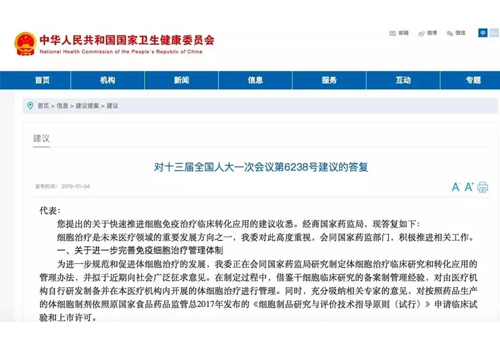 您提出的關(guān)于快速推進(jìn)細(xì)胞免疫治療臨床轉(zhuǎn)化應(yīng)用的建議收悉。經(jīng)商國(guó)家藥監(jiān)局,現(xiàn)答復(fù)如下: